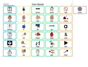 A small set of flexible words such as want, not and go, that make up roughly 80% of what we all use in many daily situations. Core words are selected for maximum use in many environments, carefully placed and ordered in a stable position for easier recall.